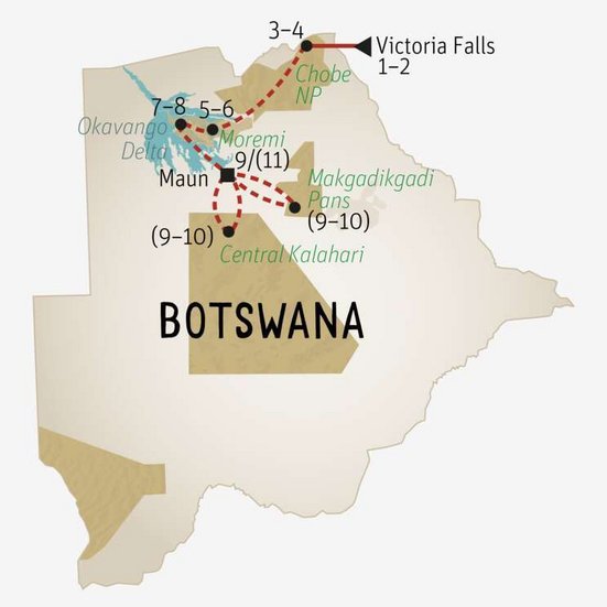 11. TAG: Kalahari/Makgadikgadi–Maun. Rückflug nach Maun. Individuelles Anschlussprogramm.