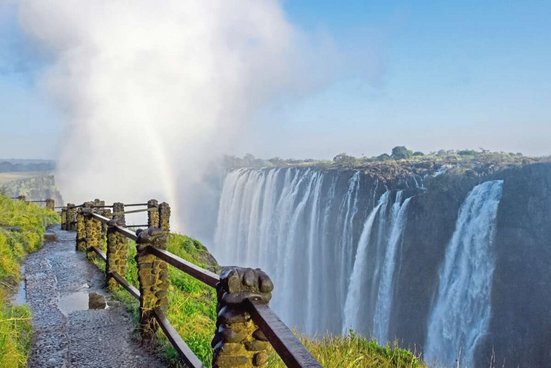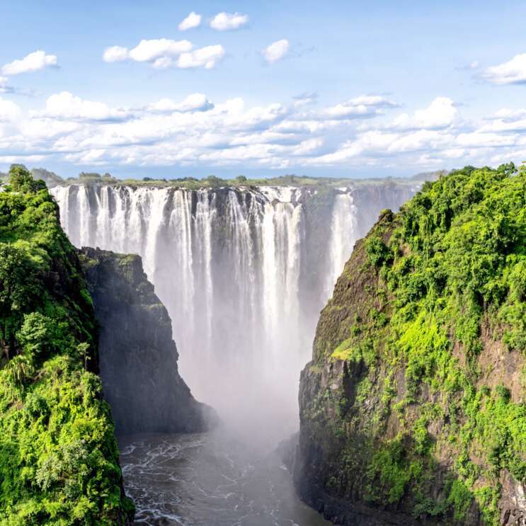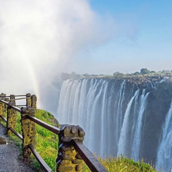 Entdecken Sie heute ausgiebig die berühmten Viktoriafälle. Die Fälle gehören zu den acht Weltwundern und sind die grössten Wasserfälle in Afrika. Es ist ein atemberaubender Anblick, wie die rauschenden Wassermassen die Fälle hinabstürzen. Die einheimischen Stämme nennen die Fälle „Mosi oa Tunya“ – der Rauch der donnert. Das Wasser stürzt hier auf einer Breite von 1708 m in die Tiefe. Wenn der Sambesi nach der Regenzeit (etwa März bis Mai) seinen höchsten Wasserstand hat, sind es 500 Millionen Liter Wasser, die hier pro Minute die 103 m in die tiefe Schlucht hinabfallen. Im Nationalpark, entlang der Fälle, führt ein Wanderweg, der Ihnen viele verschiedene Perspektiven auf das Naturschauspiel ermöglicht. Auch Helikopterausflüge sind eine beliebte Art die Wasserfälle zu besichtigen (fakultativ, vor Ort zahlbar). (Frühstück)