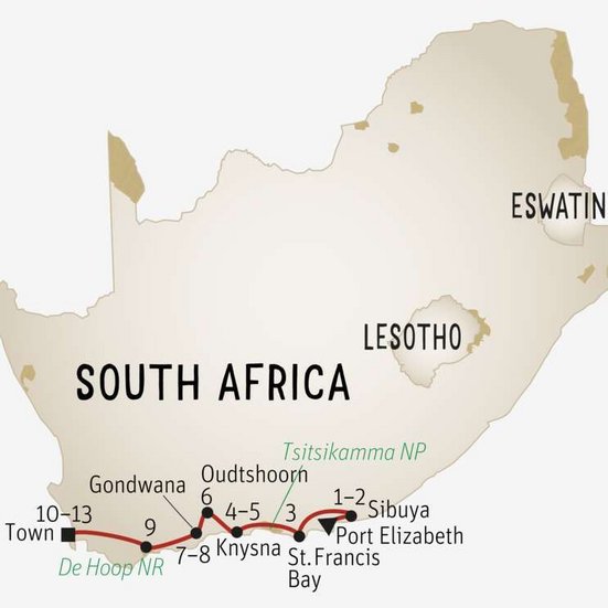 4./5. TAG: St. Francis Bay–Knysna. (± 200 km). Heute fahren Sie in das Küstenstädtchen Knysna. Tipp: Besuchen Sie unterwegs den Tsitsikamma Nationalpark. Übernachtung Bronze Elephant Hide of Knysna o. ä. (F) Silver Knysna Hollow o. ä. (F) Gold Old Rectory o. ä. (F)