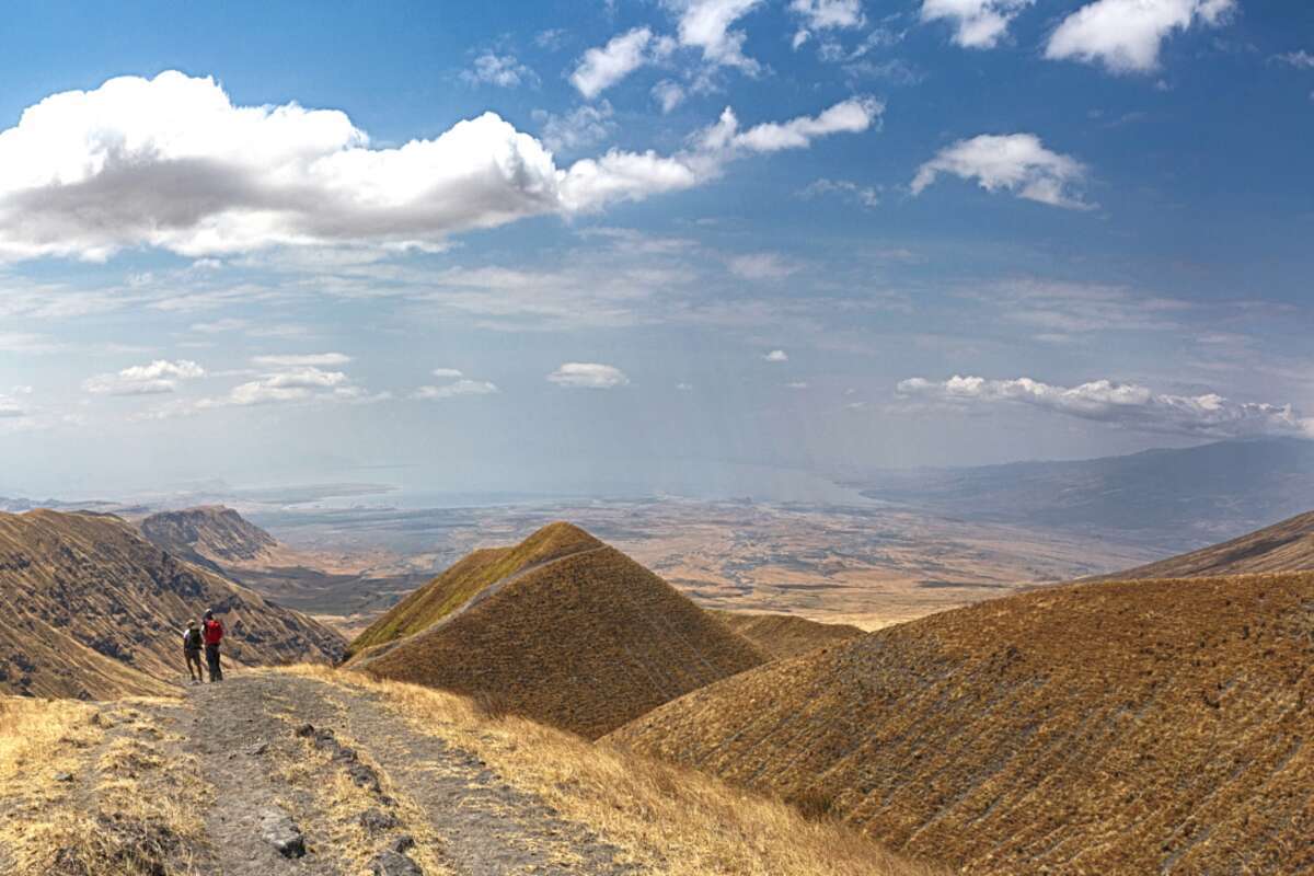 3. TAG: Rift Valley–Lake Natron. (± 6 km/4 Std.). Heute stehen Sie vor der Entscheidung, den kürzeren Weg oder die etwas längere und anstrengendere Option zu wählen. Während beiden Varianten sind Ihnen tolle Aussichten über die hügelige Landschaft sicher. Bald erscheint der einzige noch aktive Vulkan im ostafrikanischen Grabenbruch in Ihrem Blickfeld. Der Ol Doinyo Lengai ragt fast 2000 m aus der Ebene und wird gerne auch als der «Berg Gottes» bezeichnet. Nachdem Sie das Tal des Grabenbruches erreicht haben, werden Sie abgeholt und in die nächste Unterkunft gefahren. Unweit des Camps befinden sich natürliche Pools, in denen Sie sich abkühlen und von den Strapazen erholen können. Übernachtung Zeltcamp (FMA)