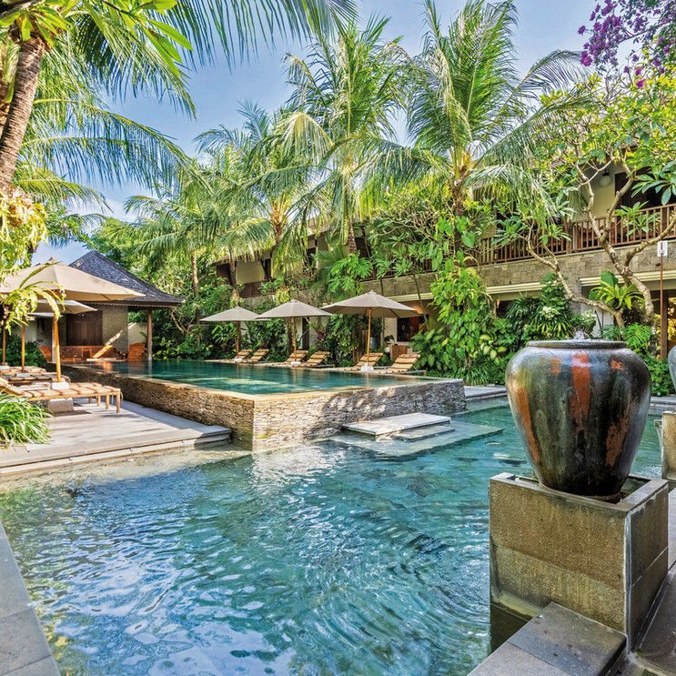 Rund um den Pool formieren sich die eleganten Wohneinheiten. Die Deluxe-Zimmer liegen im ersten Stock des Gebäudes auf Höhe der Baumwipfel.
