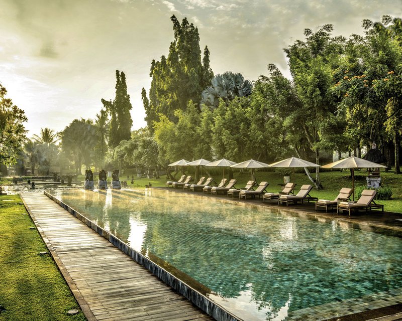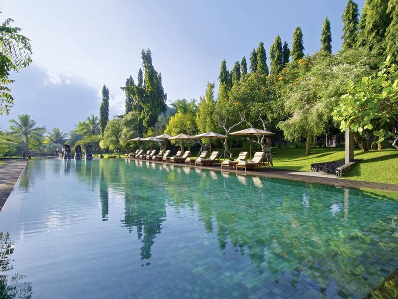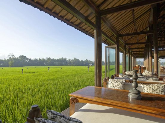 Das Hotel: Die nahezu ebenerdige Anlage liegt umgeben von Reisfeldern am Rande des Künstlerdorfs Ubud zwischen dem Monkey Forest und dem Goa-Gajah-Tempel. Das im balinesischen Stil dekorierte Resort begeistert immer wieder durch herrliche Ausblicke auf Reisfelder und die Vulkanberge West-Balis. Zu den Einrichtungen zählen ein Restaurant mit The Club Lounge, Swimmingpool (30 m) mit The Pool Bar, Amphitheater, Boutique sowie ein Fitnessbereich und ein exklusives Spa. Der Flughafen Denpasar ist ca. 35 km (1,5 Stunden) entfernt.