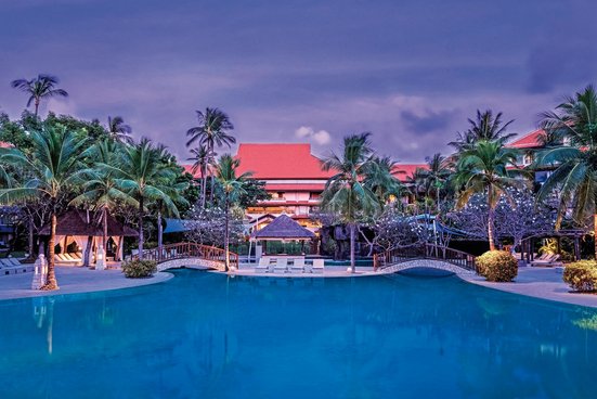 Entfliehen Sie dem Alltag und entspannen Sie am weißen Sandstrand von Nusa Dua. Im bezaubernden Hotelgarten spenden Ihnen Kokospalmen Schatten.