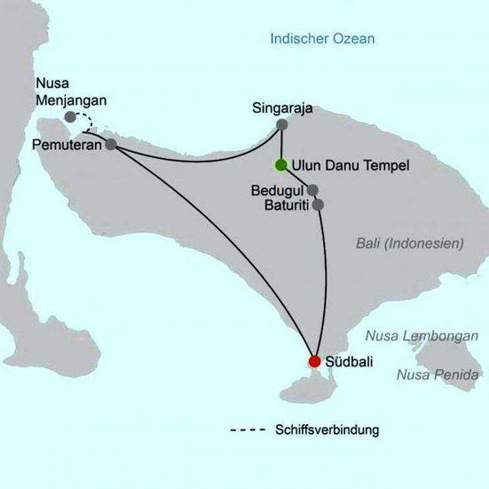Nach einem gemütlichen Frühstück besichtigen Sie den Melanting Tempel und fahren von hier aus ins Gebirge, wo Sie viele Gewürznelkenplantagen sehen. Kurze Trekking-Tour zum Munduk Wasserfall und Mittagessen in einem lokalen Restaurant. Rückkehr nach Südbali und Transfer zu Ihrem Hotel. Ende der Reise um ca. 17:30 Uhr. Ca. 245 km (F, M)