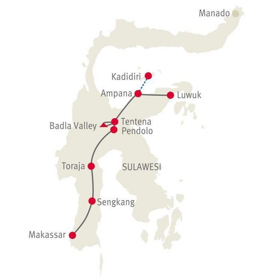 Eine eindrückliche Reise durch das kulturelle Herz Sulawesis. Majestätische Landschaften, ungewöhnliche, lebendige Traditionen und zum Schluss die magische Inselwelt der Togians. Herzliche Begegnungen unterwegs entschädigen für die einfache Infrastruktur. Ein Abenteuer weit abseits ausgetretener Pfade.