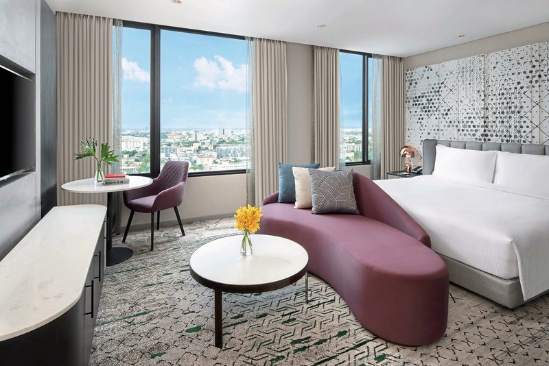- 36-40 qm, Doppel, Deluxe, Stadtblick, Schreibtisch, Couch, Dusche oder Badewanne, bodengleiche Dusche, Haartrockner, Klimaanlage, Minibar kostenpflichtig, Safe, Bügelbrett, Bügeleisen, TV, iPod-Dockingstation, Kaffee/Tee