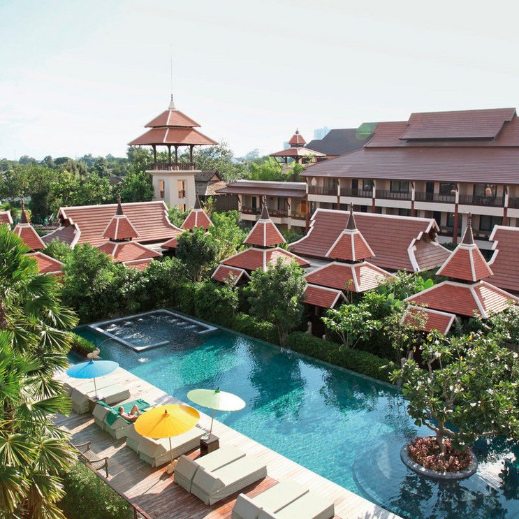 Üppige, gepflegte Gärten umgeben das komfortable Stadthotel – an Stadt erinnert hier nichts. Die Poolanlage ist dem Mae-Ping-Fluss in der alten Königsresidenz Wiang Kum Kam nachempfunden.