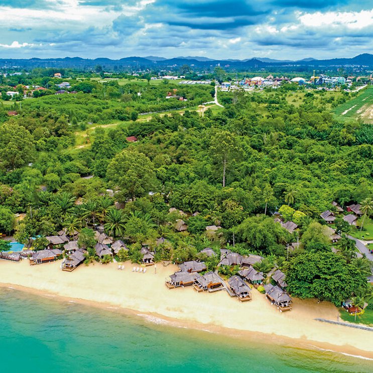 Mit Palmen gedeckte Bungalows verstecken sich im üppigen Grün, manche stehen direkt auf dem Strand an der Wasserkante: Die individuelle Bungalowanlage verheißt pures Robinson-Feeling.