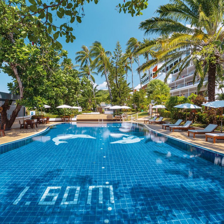 Terrassenförmig an den Hang geschmiegt, bietet das Mittelklassehotel einen sensationellen Blick über die Karon-Bucht. Hier lockt ein herrlich feiner Sandstrand. Oder Sie nutzen einen der drei Pools des Hotels!
