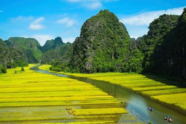 Geniessen Sie die Aussicht, entdecken versteckte Höhlen oder versuchen sich beim Fischen. Am Mittag verlassen Sie das Schiff und fahren nach Ninh Binh. Die spektakuläre Landschaft, bekannt als «trockene Halong-Bucht», zeichnet sich aus durch bizarre Kalksteinformationen und Zuckerhutberge gesäumt von Reisfeldern, Flussläufen und grünen Hügeln. Per Boot und Fahrrad entdecken Sie diese unglaubliche Naturschönheit.