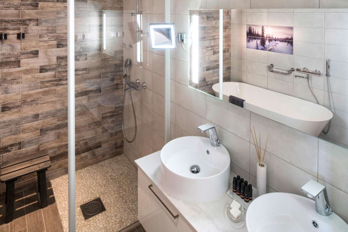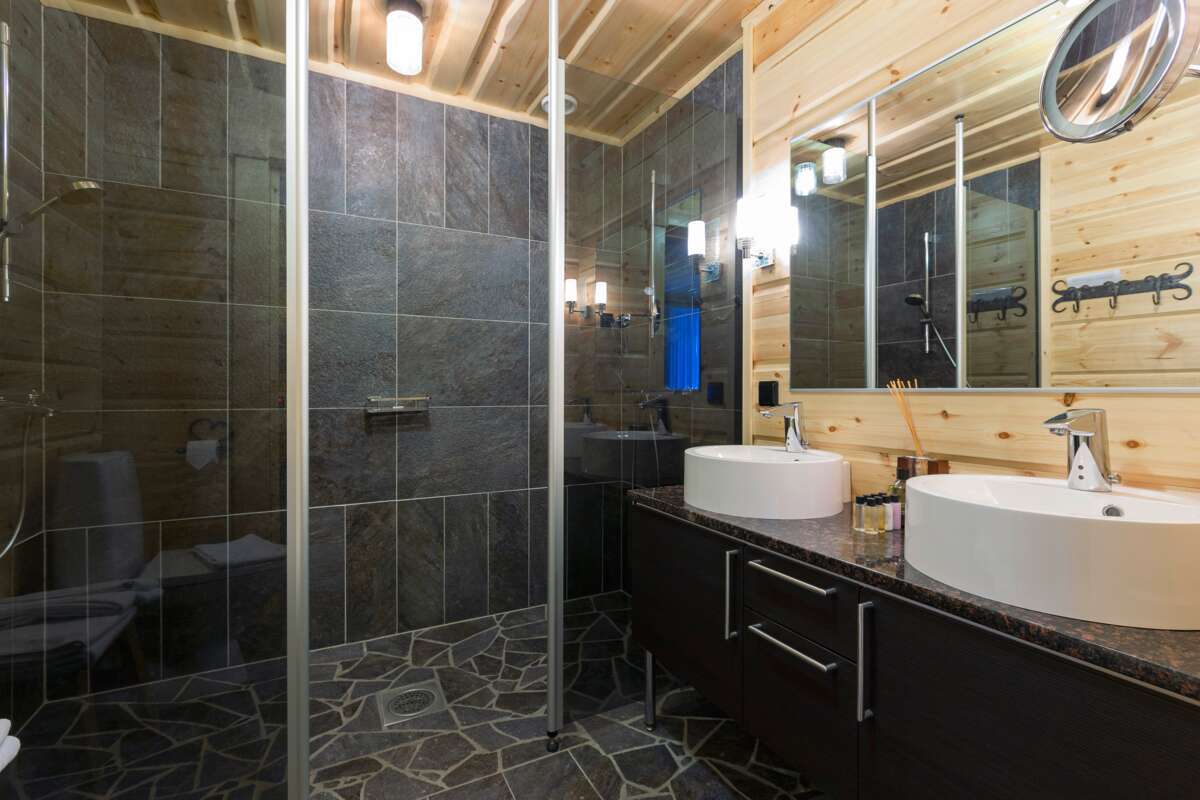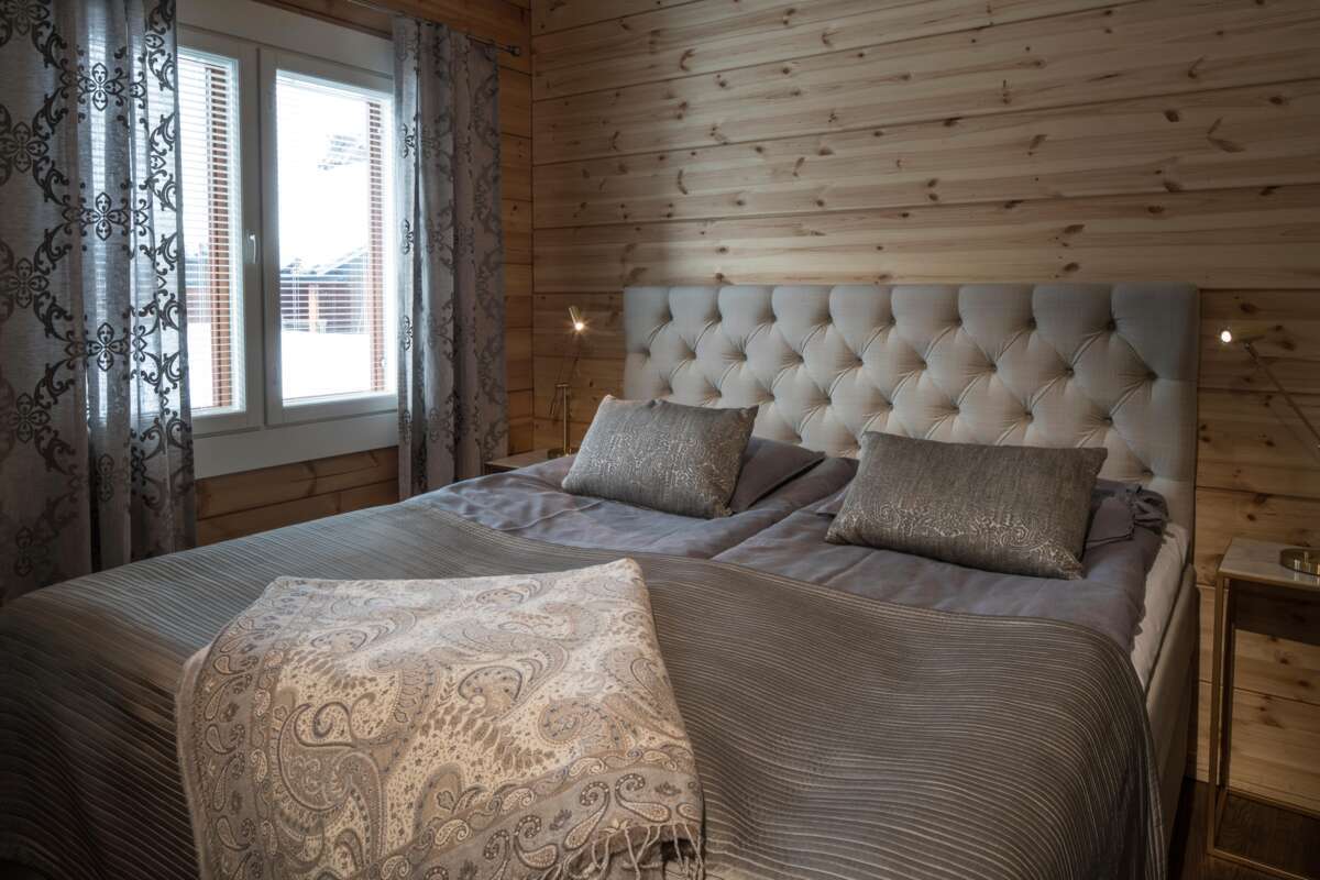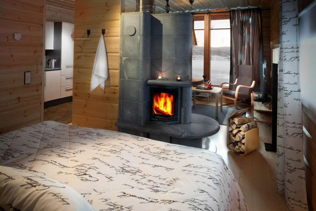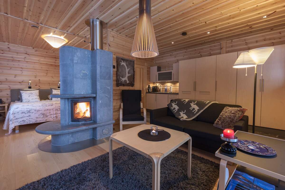 Das Herzstück dieser Unterkunft bildet das moderne, in traditioneller, finnischer Art gebaute Cheminée. Der offene Wohn- und Schlafraum (mit Kingsize-Bett) ist optisch geschickt durch den Kamin unterteilt. Somit haben Sie immer einen ausgezeichneten Blick auf das knisternde Feuer. Die grosszügigen Badezimmer mit zwei Lavabos und grossem steinernem Duschbereich wurden mit viel Liebe zum Detail geplant.