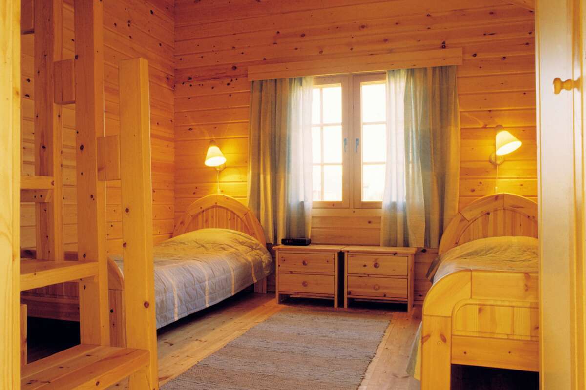 Die 32 gemütlichen, typisch finnischen Standardzimmer haben je zwei separate Betten. Vier Zimmer bilden ein Blockhaus. Auf der kleinen Galerie ist Platz für zwei Zusatzbetten für Kinder. Acht Zimmer haben keine Galerie. Diese sind über einen gemeinsamen Aufenthaltsraum mit Cheminée verbunden und verfügen ausserdem über zwei Gemeinschaftssaunas.