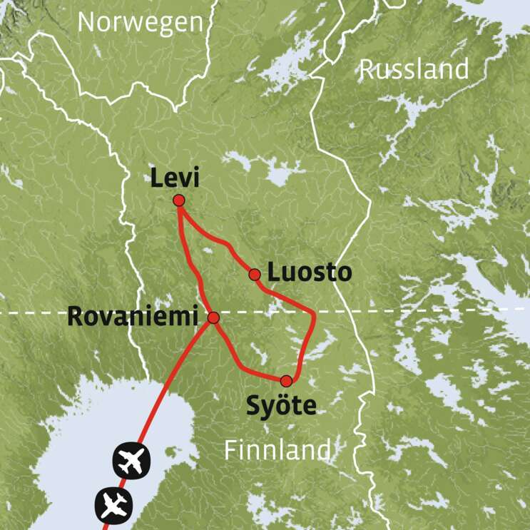 Finnland ist so vielfältig wie seine Gäste und dies zeigt sich besonders bei dieser Reise. Sie übernachten sowohl im Glasiglu als auch in einem Boutiquehotel. Sie besuchen den Weihnachtsmann in seiner Heimatstadt am Polarkreis und haben Zeit für Aktivitäten in der Winterwunderwelt von Syöte und Luosto.