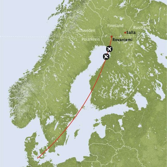 Direktflug nach Rovaniemi und Übernahme des Mietwagens. Dank der in Finnland üblichen Winterreifen mit Spikes gewöhnen Sie sich schnell ans Fahren auf schneebedeckten Straßen – und es macht sogar richtig Spass. Nach ca. zwei Stunden Fahrt erreichen Sie Salla.