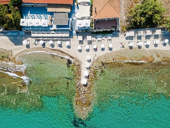 - Sand-/Kieselstrand: flach abfallend, gehört zur Anlage, ca. 600 m lang, Liegen, Liegestühle, Strandtuch/Badetuch (kostenpflichtig), Umkleidekabinen, sanitäre Anlage (Dusche), sanitäre Anlage (WC)