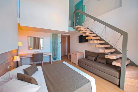 - 41-45 qm, Maisonette, 2 Etagen, Meerblick, 2 separate Schlafzimmer, 2 Bäder, Dusche, Badewanne, Haartrockner, Klimaanlage, Minibar, Auffüllung regelmäßig, Bier, Säfte, Hauswein, Wasser, Safe, TV (Sat-TV), Wasserkocher, Balkon