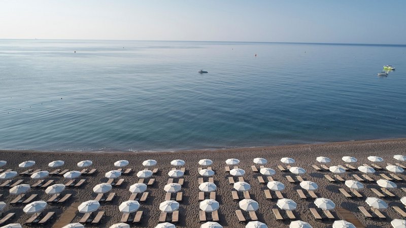 - Sand-/Kieselstrand: flach abfallend, Sonnenschirme, Liegen, Strandtuch/Badetuch