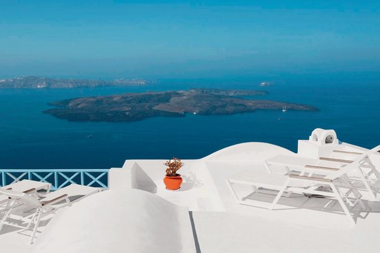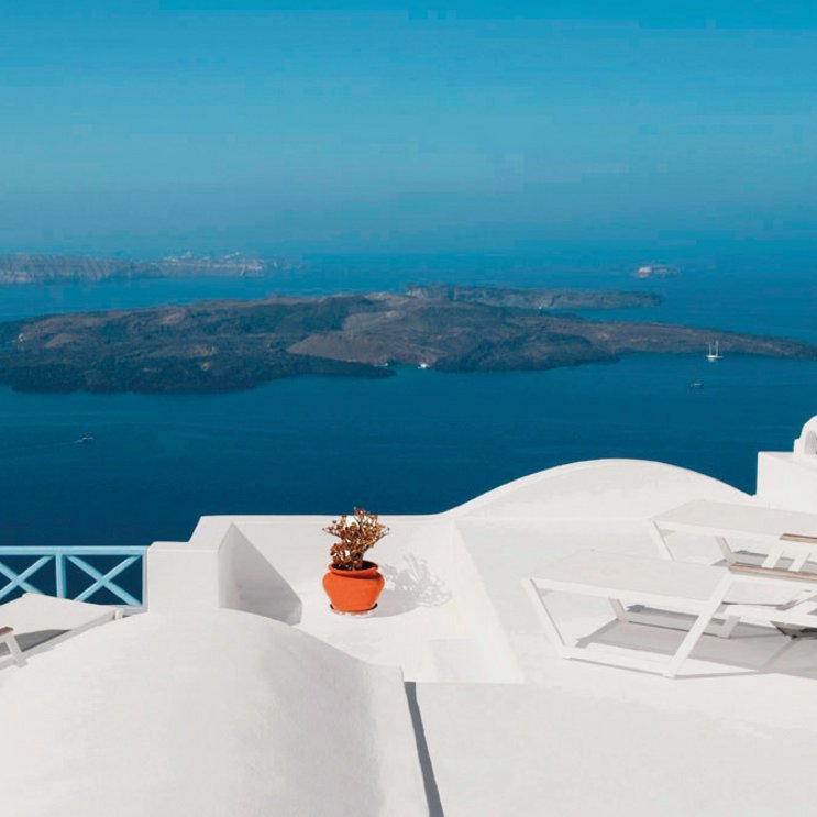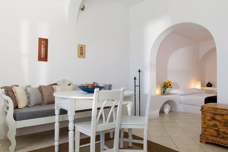 In Imerovigli strahlen die weißen Häuser vor schwarzem Vulkangestein. Sonnendurchflutet ist die gesamte Anlage der Gorgona Villas: Sie werden Ihre helle Freude haben!