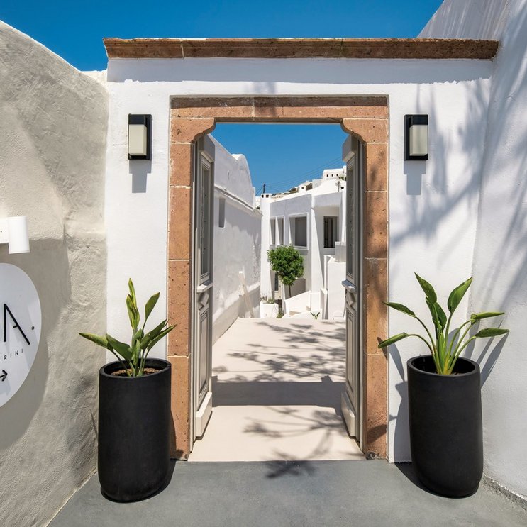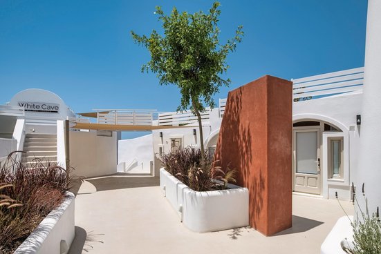 Weit oben, am Ortsrand von Firostefani, bietet sich schon zum Frühstück ein atemberaubender Blick auf die Caldera! Und auch sonst weiß das Hotel zu bezaubern: mit moderner Eleganz und traditionellen Design-Elementen.
