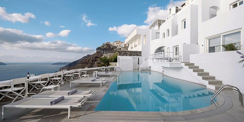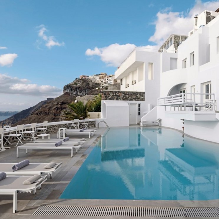 In Fira, dem Hauptort der Insel, mit Panoramablick auf die umliegende Inselwelt und die tiefblaue Ägäis, durch die weiße Schiffe kreuzen. Einen herrlichen Blick haben Sie von der Poolbar aus. Atemberaubend sind die Sonnenuntergänge, hier am Rand des Vulkankraters.