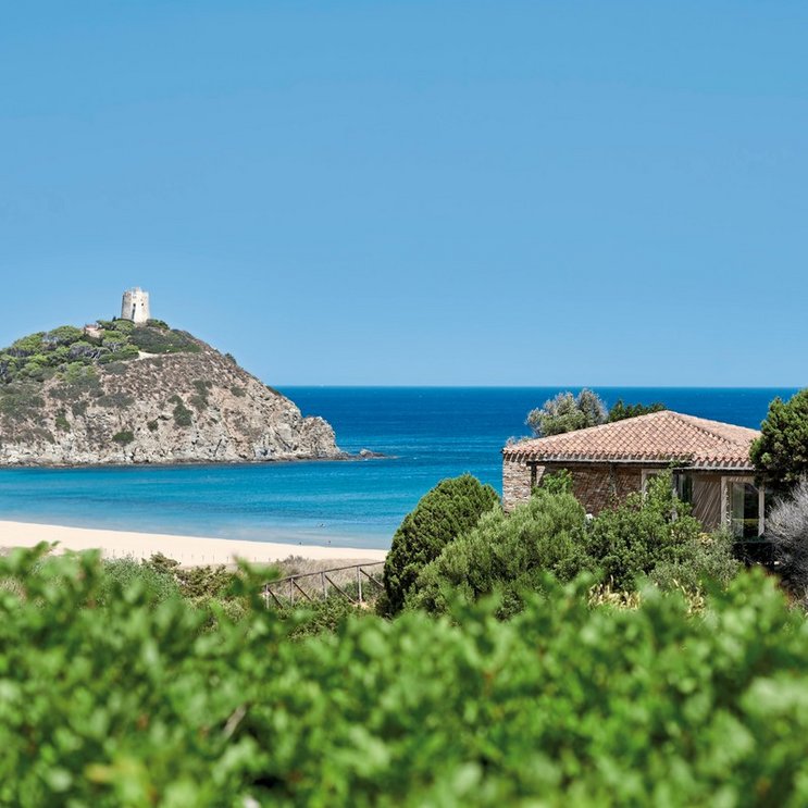 In Hanglage, inmitten des Chia Laguna Resorts, mit herrlichem Blick über den Strand Monte Cogoni. In der Ferne wacht der bekannte Turm Torre di Chia - malerisch!