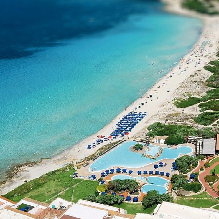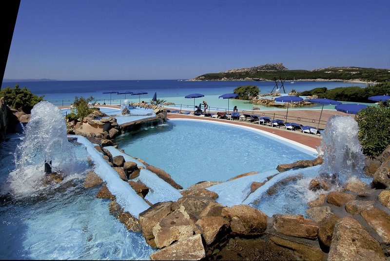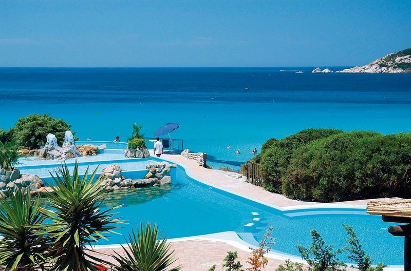 Nirgendwo leuchten Sardiniens Farben strahlender! Das Azurblau der Poollandschaft scheint sich über mehrere Ebenen im Türkisblau und Smaragdgrün des Meerwassers zu verlieren, nur unterbrochen vom strahlend weißen, feinen Sandstrand. Himmlisch!