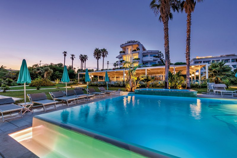 Elegantes Interieur, geschmackvolle Farben und moderner Komfort prägen das Ambiente des neu eröffneten Hotels. Wunderschön ist auch der Poolbereich im weitläufigen Garten der Anlage.
