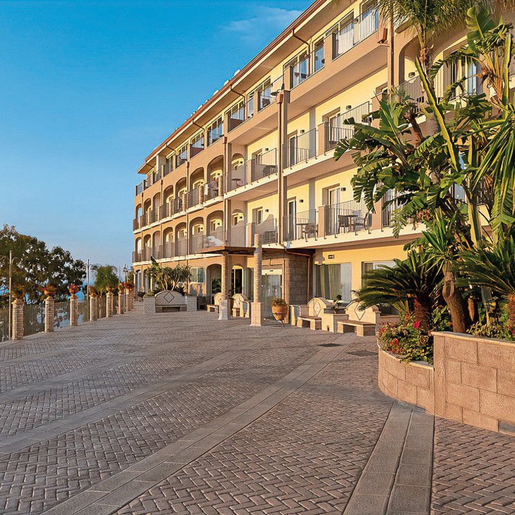 Hier liegt Ihnen das Meer zu Füßen! Die weitläufige Anlage glänzt mit spektakulärem Ausblick auf die Bucht von Taormina, aber auch schönen Pools. Lassen Sie sich außerdem im Wellnesszentrum Nettuno verwöhnen!