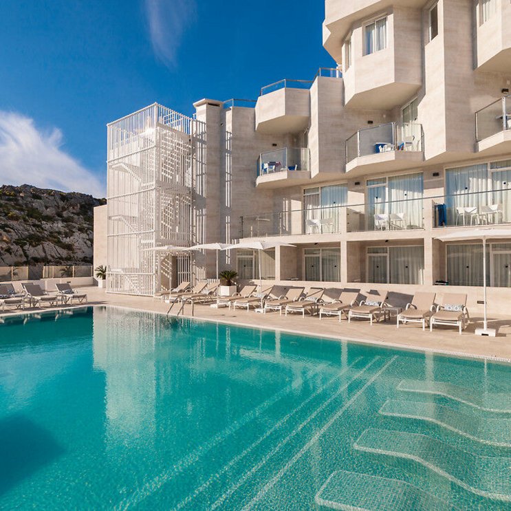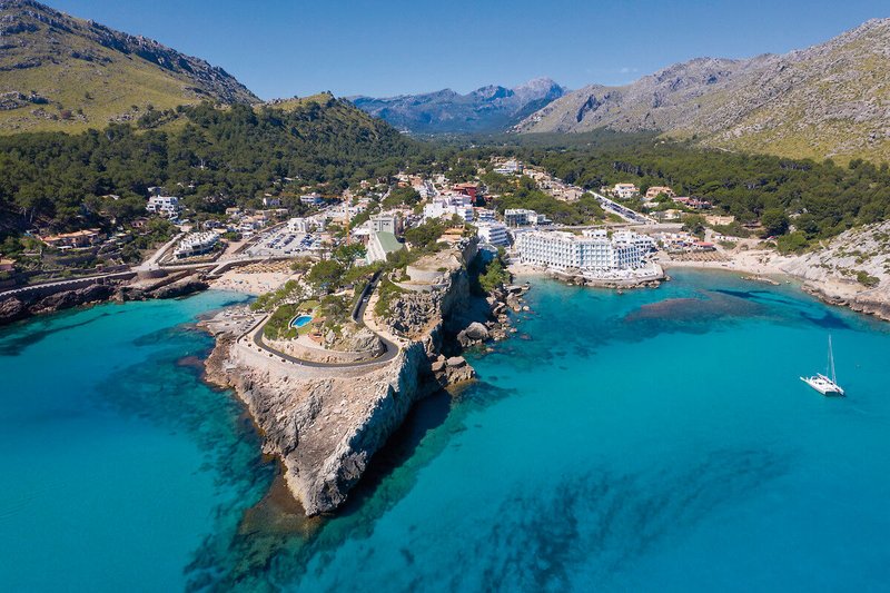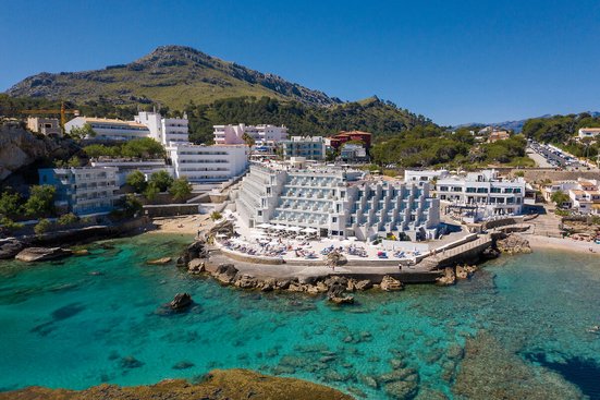In diesem Hotel an der Cala San Vicente erholen sich Erwachsene ganz in Ruhe bei Halbpension oder Alles inklusive. Das weiße Gebäude strahlt zwischen zwei Buchten mit herrlich kristallklarem Wasser.