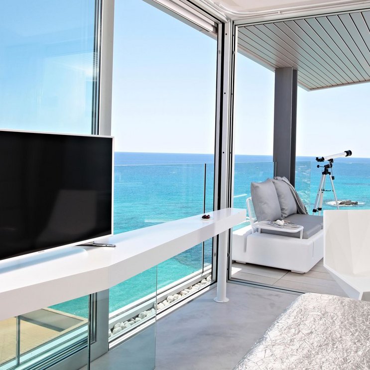 - 36-40 qm, Juniorsuite, Superior, Meerblick, offenes Bad im Zimmer, bodengleiche Dusche, Bademantel, Badeslipper, Haartrockner, Klimaanlage, Minibar kostenpflichtig, Safe, 1 TV (Sat-TV), iPod-Dockingstation, WLAN, Espressomaschine, Balkon (möbliert), Whirlpool, Kopfkissen-Menü, Kapseln sind kostenfrei