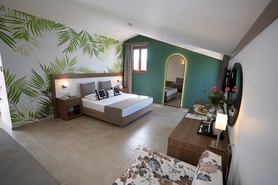 - 41-45 qm, Familien, Nebengebäude, Poolblick, 2 separate Schlafzimmer, 2 Einzelbetten, Doppelbett, 1 Bad, Dusche oder Badewanne, WC, Haartrockner, Klimaanlage, zentral gesteuert, Minibar, Auffüllung bei Anreise, Safe, 1 TV (Sat-TV), Balkon (möbliert)