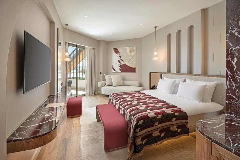 - 81-90 qm, Suite, Bettwäsche, Handtücher und Matratzen aus 100% Bio-Baumwolle, separates Schlafzimmer, separater Wohnraum, Schreibtisch, Doppelbetten (1 Doppel- oder 2 Einzelbetten), Sofabett, 2 Bäder, Dusche, WC, Bademantel, Badeslipper, Haartrockner, Kosmetikspiegel, Laminatboden, Klimaanlage, Minibar, Auffüllung regelmäßig, Safe, Bügelbrett, Bügeleisen, TV (Sat-TV), Wasserkocher, Kaffeemaschine, Terrasse, direkter Poolzugang, Gemeinschaftspool, Kopfkissen-Menü, Aufdeck-Service