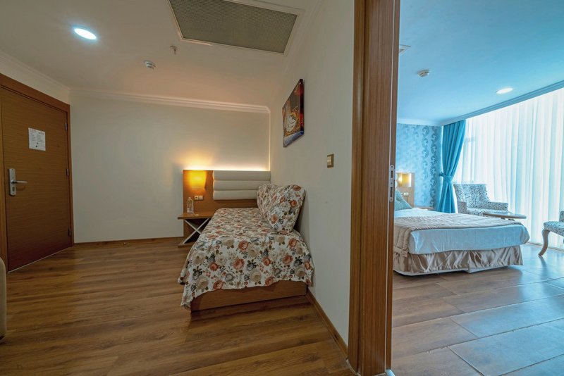 - 26-30 qm, Familien, mit Verbindungstür, Einzelbett, Doppelbetten (1 Doppel- oder 2 Einzelbetten), Schlafsessel, Dusche, WC, Haartrockner, Laminatboden, Klimaanlage, zentral gesteuert, Mini-Kühlschrank, Safe, TV (Sat-TV), Wasserkocher, Kaffee/Tee, Balkon