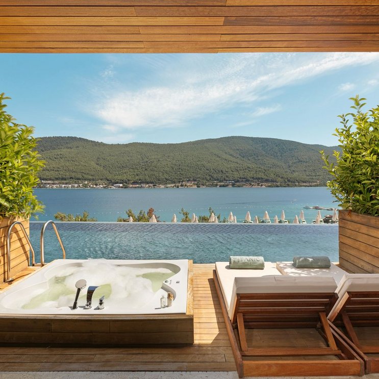 - 71-80 qm, Doppel, Deluxe, Meerseite, Meerblick (zum Teil), Bettwäsche, Handtücher und Matratzen aus 100% Bio-Baumwolle, optisch getrennter Wohn-/Schlafraum, Sitzecke, Schreibtisch, Dusche, WC, separates WC, Bademantel, Badeslipper, Haartrockner, Kosmetikspiegel, Klimaanlage, zentral gesteuert, Minibar, Auffüllung täglich, Safe, Bügelbrett, Bügeleisen, TV (Sat-TV), WLAN, Wasserkocher, Espressomaschine, Kaffee/Tee, Terrasse (möbliert), direkter Poolzugang, Kopfkissen-Menü, hochwertige Badartikel, Aufdeck-Service