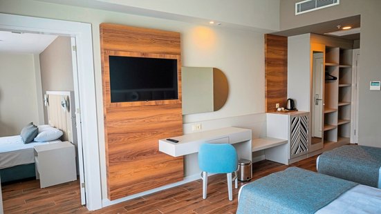 - 46-50 qm, Suite, Komfort, 2 separate Schlafzimmer, Dusche, bodengleiche Dusche, WC, Haartrockner, Fliesen, Klimaanlage, zentral gesteuert, Minibar, Auffüllung täglich, Wasser, Safe (kostenpflichtig), 2 TVs (Sat-TV, Flachbildschirm), WLAN, Wasserkocher, Kaffee/Tee, Balkon