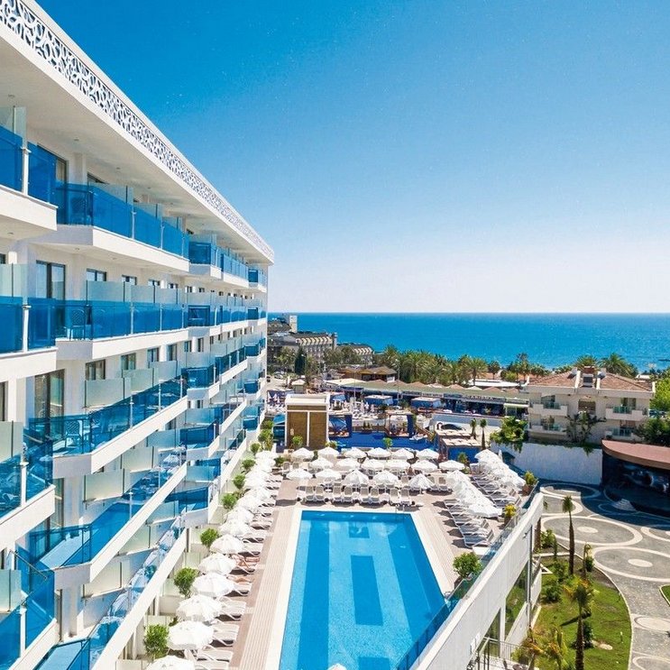 Der Ausblick auf das Meer, die Halbinsel von Side und die Berge im Inland ist herrlich. Wem das Treiben im Aquapark zu bunt ist, genießt die Ruhe am Relaxpool, der Gästen ab 18 Jahren vorbehalten ist.