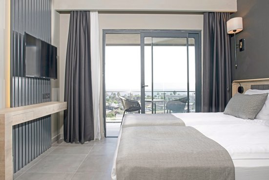 - 31-35 qm, Familien, mit Verbindungstür, 2 separate Schlafzimmer, 2 Einzelbetten, Doppelbett, 1 Bad, Dusche, 1 WC, Haartrockner, Kosmetikspiegel, Fliesen, Klimaanlage, individuell regulierbar, Mini-Kühlschrank, Safe, 1 TV (Sat-TV), Wasserkocher, Kaffee/Tee, Balkon (möbliert)