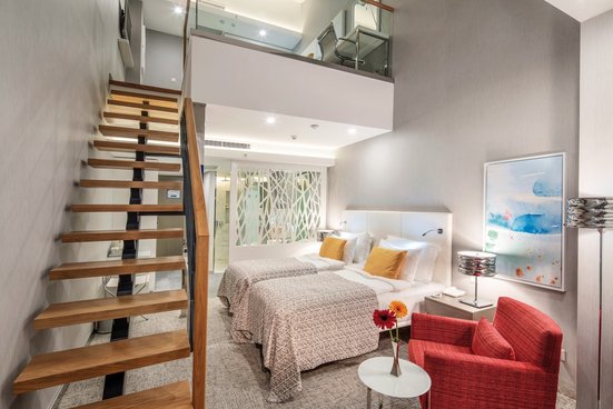 - 41-45 qm, Maisonette, 2 Etagen, Hauptgebäude, Meerblick, Bettwäsche, Handtücher und Matratzen aus 100% Bio-Baumwolle, 2 separate Schlafzimmer, Sitzecke, 2 Twinbetten, französisches Bett, 2 Bäder, Dusche, Haartrockner, Teppich, Klimaanlage, zentral gesteuert, Minibar, Auffüllung bei Anreise, Softdrinks, Wasser, Safe, 2 TVs (Sat-TV, Flachbildschirm), Wasserkocher, Kaffee/Tee, Balkon (möbliert)