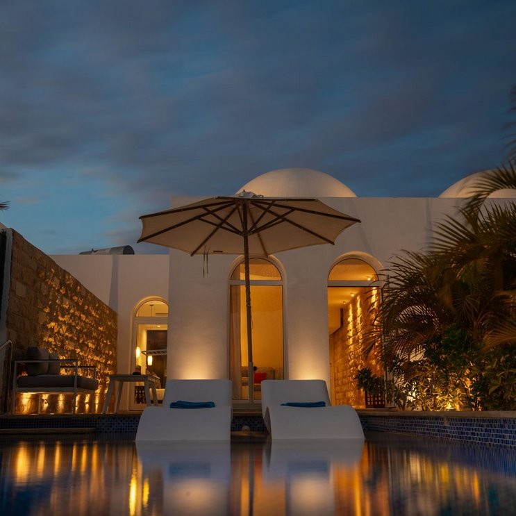 - 81-90 m², villa, duplex, 2 chambres à coucher séparées, 1 séjour séparé, 2 lits double (king-size), 2 salles de bains, douche, peignoir, chaussures de bain, sèche-cheveux, miroir cosmétique, climatisation, minibar, soft drinks, bière, jus, vin maison, eau, Snacks, coffre-fort, TV, machine à café, terrasse (meublé), accès direct à la piscine, choix d’oreillers, espace de check-in et check-out séparé, esppace séparé à la plage, hors-d'œuvre l'après midi, articles de bain de haute qualité, dîner au restaurant de spécialités, réduction sur les soins spa, service de couverture