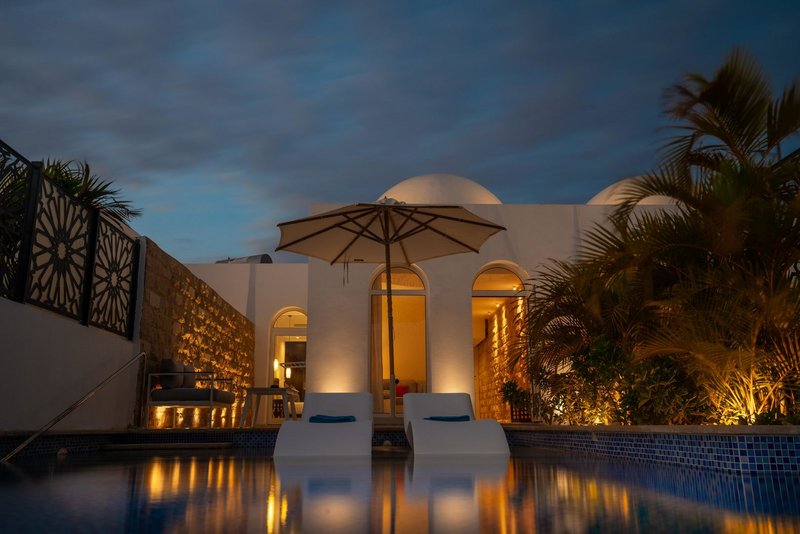 - 51-60 m², villa, vue sur le jardin, vue sur la piscine, 1 chambre à coucher séparée, 1 séjour séparé, lit double (king-size), douche, peignoir, chaussures de bain, sèche-cheveux, miroir cosmétique, climatisation, minibar, soft drinks, bière, jus, vin maison, eau, Snacks, coffre-fort, TV, machine à café, terrasse (meublé), accès direct à la piscine, choix d’oreillers, espace de check-in et check-out séparé, esppace séparé à la plage, hors-d'œuvre l'après midi, articles de bain de haute qualité, dîner au restaurant de spécialités, réduction sur les soins spa, service de couverture
