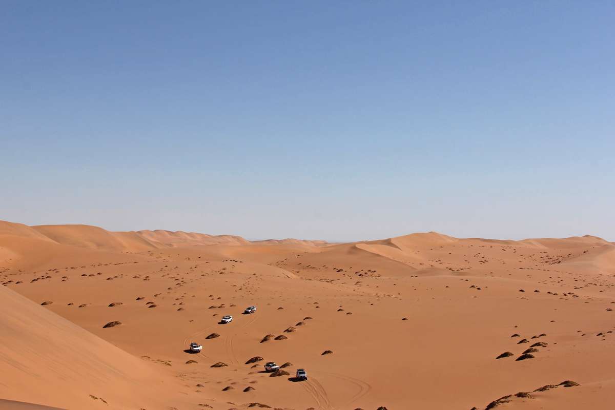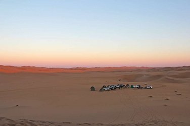1ᴱᴿ JOUR: Walvis Bay–Parc national de Namib-Naukluft. (± 80–120 km). Ce voyage d'aventure débute par un trajet d'une trentaine de minutes au sud de Walvis Bay jusqu'à Rooibank. Ici, vous rencontrerez votre guide, qui vous accompagneront ces prochains jours. Ensemble, vous gravirez des dunes pratiquement insurmontables. Vous serez constamment en contact radio avec votre guide. Il vous dira ainsi exactement comment faire pour monter et descendre ces dunes. Bientôt vous laisserez derrière vous la civilisation et ne verrez plus que d'imposantes dunes et des champs sablonneux de tous côtés. Le but d'aujourd'hui s'appelle «Linear Dune Belt». Le vent a formé ces dunes qui à droite comme à gauche ont exactement la même forme. En fin d'après-midi, vous rejoindrez votre camp. Si vous le souhaitez, vous pouvez dormir dans la tente sur le toit de votre véhicule mais nous vous conseillons de dormir à la belle étoile. La voûte céleste dans le désert du Namib est étincelante. Des toilettes et une douche de brousse sont à la disposition de tout le groupe. Nuitée au camping (S)