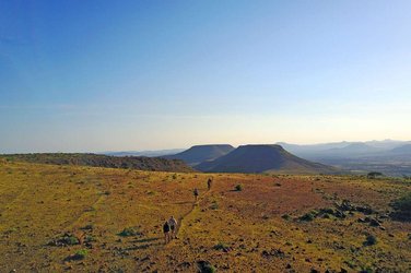 2ᴱ JOUR: Montagnes Etendeka. (± 18 km/7 heures). Réveil avec les premiers rayons du soleil. L'eau chaude est déjà en train de bouillir sur le feu pour votre café du matin. Le petit-déjeuner copieux donne des forces pour la randonnée à venir et vous met d'attaque pour la journée. La randonnée dure environ 6–7 heures. L'itinéraire vous emmène à travers des paysages spectaculaires. Même si la région semble un peu stérile à première vue, des animaux y vivent et il y a une grande variété de plantes. Votre guide vous expliquera avec enthousiasme ce qui pousse ici et quels animaux survivent dans cette région. Si vous avez de la chance, un zèbre, un oryx ou une antilope croisera votre chemin. Aujourd'hui, votre campement se trouve sur une montagne que l'on appelle montagne de cristal. D'ici, vous pouvez voir d'étranges formations rocheuses. Mais, ce sont surtout les nuits qui sont spectaculaires. La Namibie est considérée comme l'un des pays ayant le moins de pollution lumineuse, de sorte que vous pouvez voir le ciel étoilé dans toute sa splendeur. Même la Voie lactée est facilement reconnaissable. Nuitée au camp mobile (PdDS)