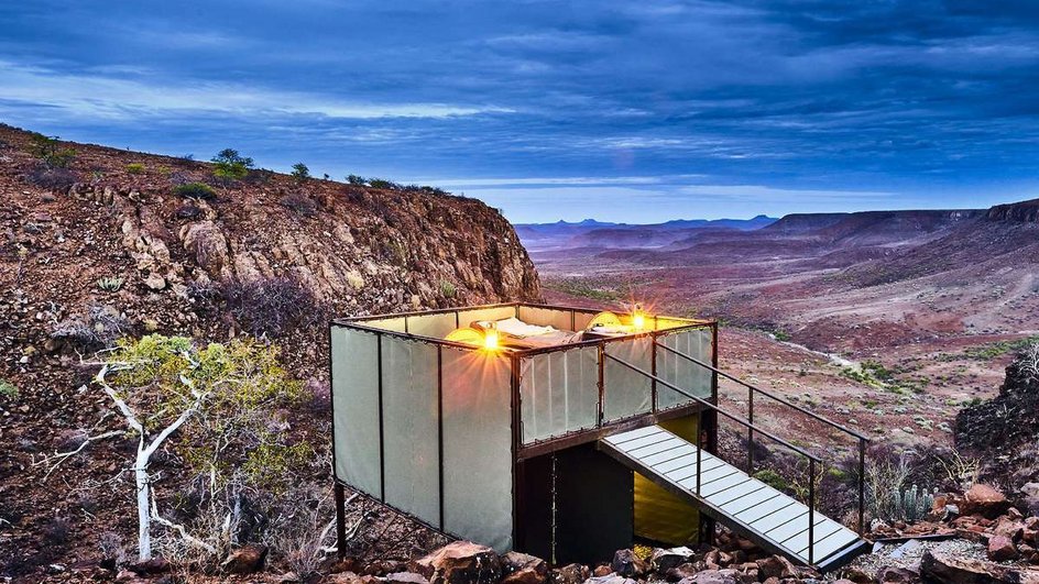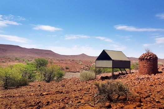 1ᴱᴿ JOUR: Montagnes Etendeka. (± 6 km/3 heures). Arrivée individuelle au Palmwag Lodge. C'est ici de vous garerez votre voiture et à 16h00, vous rencontrerez votre groupe et votre guide. Il vous donnera tous les conseils et informations nécessaires et vous expliquera le programme de ces prochains jours. Vos bagages seront transportés jusqu'à votre campement, vous n'avez à emporter que votre sac à dos avec vous. La première randonnée offre des vues spectaculaires sur des formations rocheuses intactes. Votre premier campement se trouve sur un lit de rivière asséché. Vous dormirez dans des lits confortables sur l'une des cinq plates-formes surélevées. Pendant la journée, l'auvent assure un ombrage bienvenu et une fois la nuit venue, il est enlevé afin que vous puissiez avoir une vue dégagée et profiter pleinement de la voûte étoilée d'Afrique. La plate-forme est équipée d'un WC et d'un lavabo. Une douche de brousse est partagée par deux tentes chacune. Le dîner est préparé par le personnel et mijoter sur le feu. Nuitée au camp mobile (S)