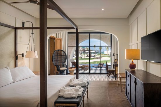 - 51-60 m², Junior Suite, rez-de-chaussée, vue sur la piscine, séjour/chambre à coucher optiquement séparés, coin salon, lits double (1 lit king-size ou 2 lits queen-size), canapé-lit, bain à remous, douche à effet de pluie, WC, sèche-cheveux, miroir cosmétique, climatisation, minibar, remplissage régulièrement, soft drinks, bière, eau, coffre-fort, planche à repasser, fer à repasser, TV, machine à café, terrasse (meublé), accès direct à la piscine, piscine partagée