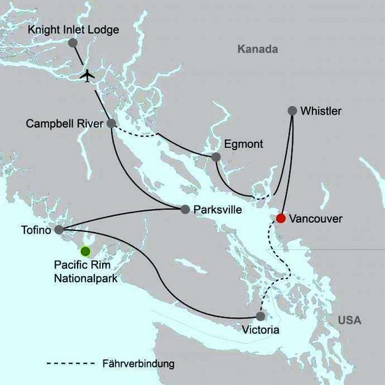 La route d'aujourd'hui vous mène via Port Alberni à travers l'île de Vancouver jusqu'à la côte ouest dans le pittoresque village de pêcheurs de Tofino, situé dans le parc national de Pacific Rim, un pointde départ idéal pour des excursions. 3 nuits à l'hôtel Water's Edge Shoreside Suites. Environ 175 km.