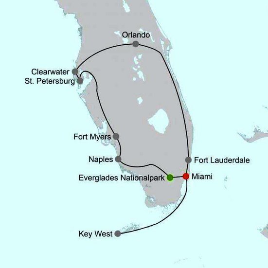 Aujourd'hui, nous retournons à Miami, par exemple en empruntant la route côtière A1A. Il est grand temps de faire vos derniers achats ! Restitution de votre voiture de location réservée séparément, départ ou début de votre séjour de correspondance. Environ 50 km
