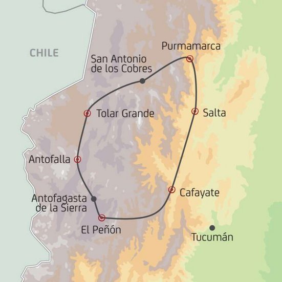 En passant par le lac salé d’Arizaro, vous arrivez au Cono de Arita, une montagne parfaitement conique de 122 m de haut, un miracle de la nature et un sujet de photo très apprécié. Vous continuez vers l’oasis d’Antofalla, où vivent une soixantaine de personnes. À 4 200 m d’altitude, des lamas, des ânes et des vigognes paissent sur les rives du lac salé d’Antofalla. Avec ses 160 km de longueur, c’est le plus long lac salé du monde. Via Antofagasta, vous arrivez à El Peñon (3 400 m), où vous passerez les trois prochaines nuits.