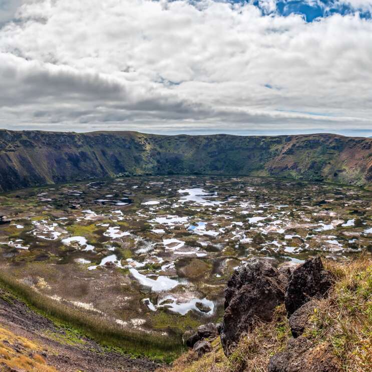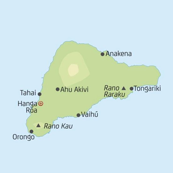 Cette excursion vous conduit au volcan Rano Kau. Au sommet de cet impressionnant volcan s’élève l’ancien site cérémoniel d’Orongo. C’est ici qu’avait lieu le combat de l’homme-oiseau qui occupait une importante position spirituelle et politique sur l’île. Depuis le point de vue du volcan, vous jouissez d’une vue fantastique sur une grande partie de l’île et le cercle parfait du lac du cratère. L’après-midi, vous visitez le site d’Ahu Akivi, le seul sanctuaire érigé à l’intérieur des terres. En outre, c’est le seul endroit où les moais ont le regard tourné vers l’océan, en direction des îles Marquises.