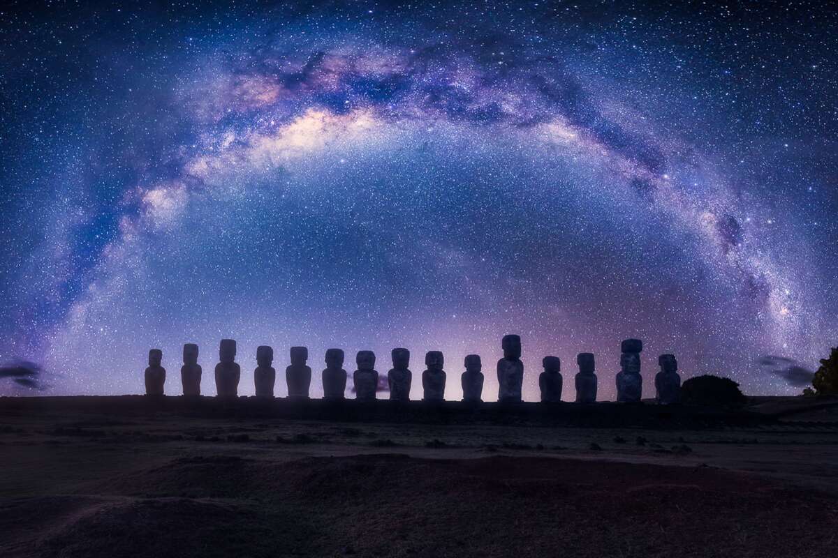 La journée est entièrement consacrée aux curiosités de l’île. La première halte est prévue aux ruines de Vaihu, une plateforme ressemblant à un autel avec huit statues gigantesques renversées gisant face contre terre. Vous suivez ensuite la côte sud jusqu’au symbole de l’île, le volcan Rano Raraku. Le lieu était anciennement la carrière où les moais étaient taillés. À Ahu Tongariki, vous visitez le site archéologique le plus spectaculaire de l’île. Sur la plateforme de lave sont alignées quinze statues colossales le long du Pacifique. L’ensemble constitue un décor saisissant avec l’étendue bleutée de l’océan dans le dos de ces géants de pierre. Vous terminez la journée à Anakena, un paradis de la baignade, ourlé par des eaux magnifiques. Ensuite, retour à l’hôtel
