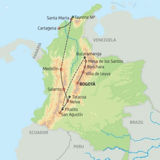 La culture, le café et les Caraïbes, résument merveilleusement bien ce voyage à travers la Colombie. La diversité qu’offre ce pays est exceptionnelle, jugez-en par vous-même. Vous allez être emporté par un voyage à couper le souffle à travers un pays incomparable : coloré - culinaire - culturel - coquet – complet ! Un autre atout est les habitants de la Colombie, qui se distinguent par leur hospitalité et leur serviabilité.